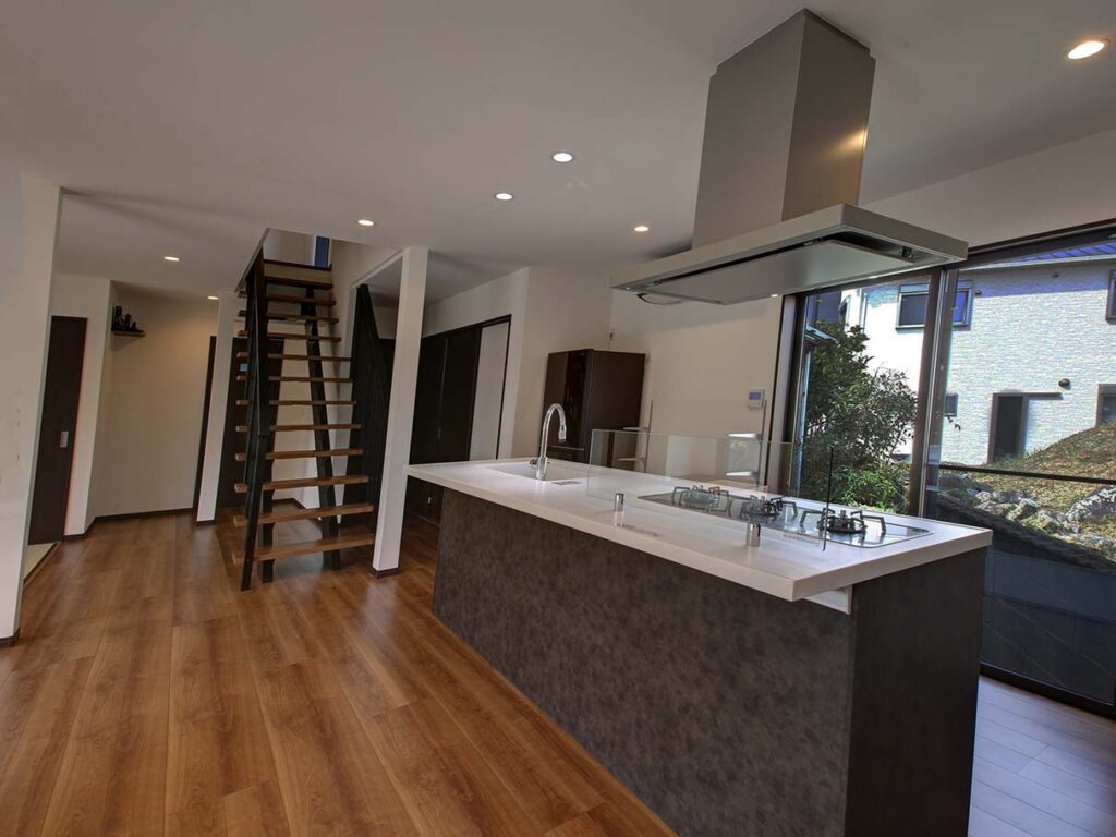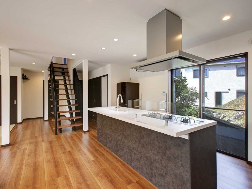 6人家族の20畳のリビングダイニングルームに設置した広々としたキッチン。2階に上がる階段もあります。お客様は大変喜んでおられました。